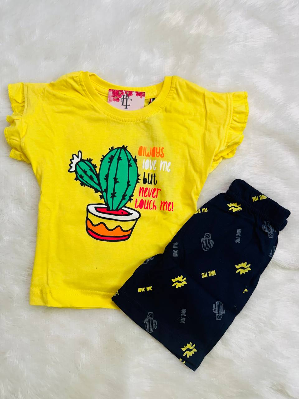 Bright, bold, and full of attitude, this Cactus Cutie girls cotton dress set is designed to make everyday dressing fun and stylish. The set features a vibrant yellow T-shirt with an eye-catching cactus graphic and playful text that adds a cute, sassy charm girls will love. The ruffled sleeve detail enhances the overall look, giving it a trendy and adorable finish. Paired with classic black shorts printed with subtle cactus and fun text motifs, this outfit creates a perfect balance of color and style.