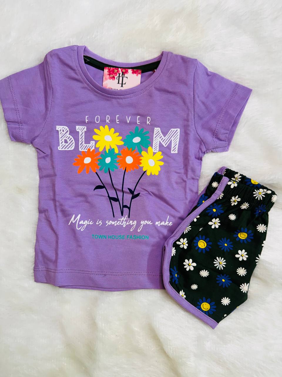 The Forever Bloom Edition (Lavender/Black) features a soft lavender T-shirt highlighted with a multicolor floral “Forever Bloom” print, paired with black shorts detailed with cute daisy and smiley motifs for a fun, youthful look.