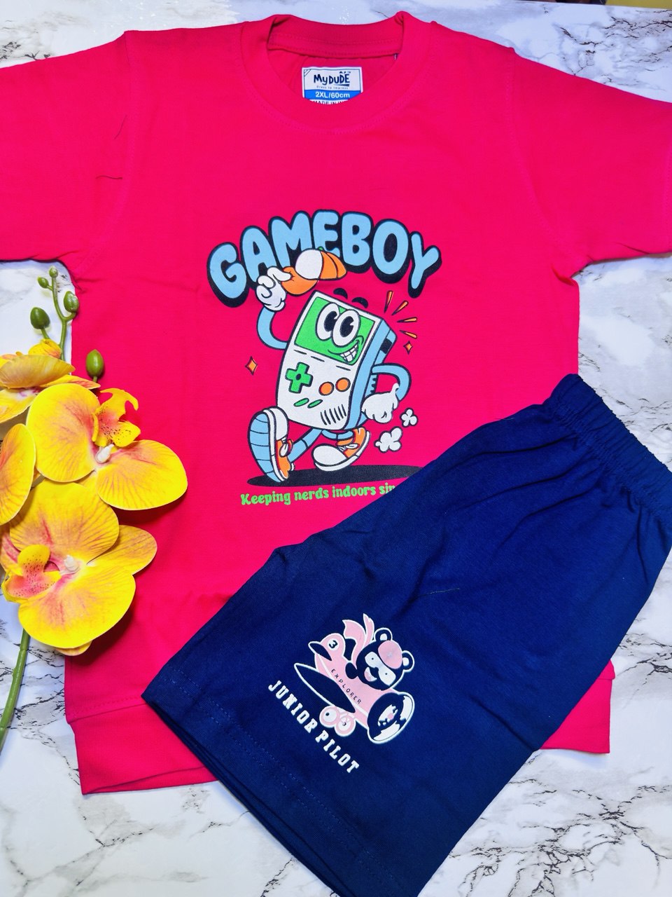 Top: Bright red half-sleeve T-shirt featuring a fun “Gameboy” character print.