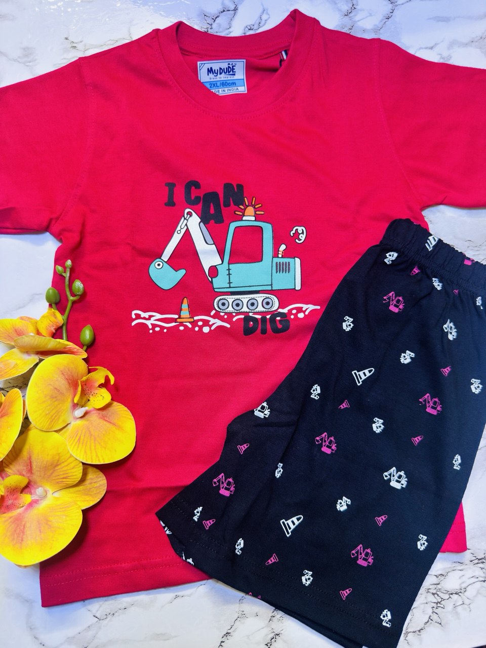 The Master Builder (Red/Patterned Black): Features a high-contrast “I Can Dig” excavator print with matching construction-patterned shorts for the little engineer.