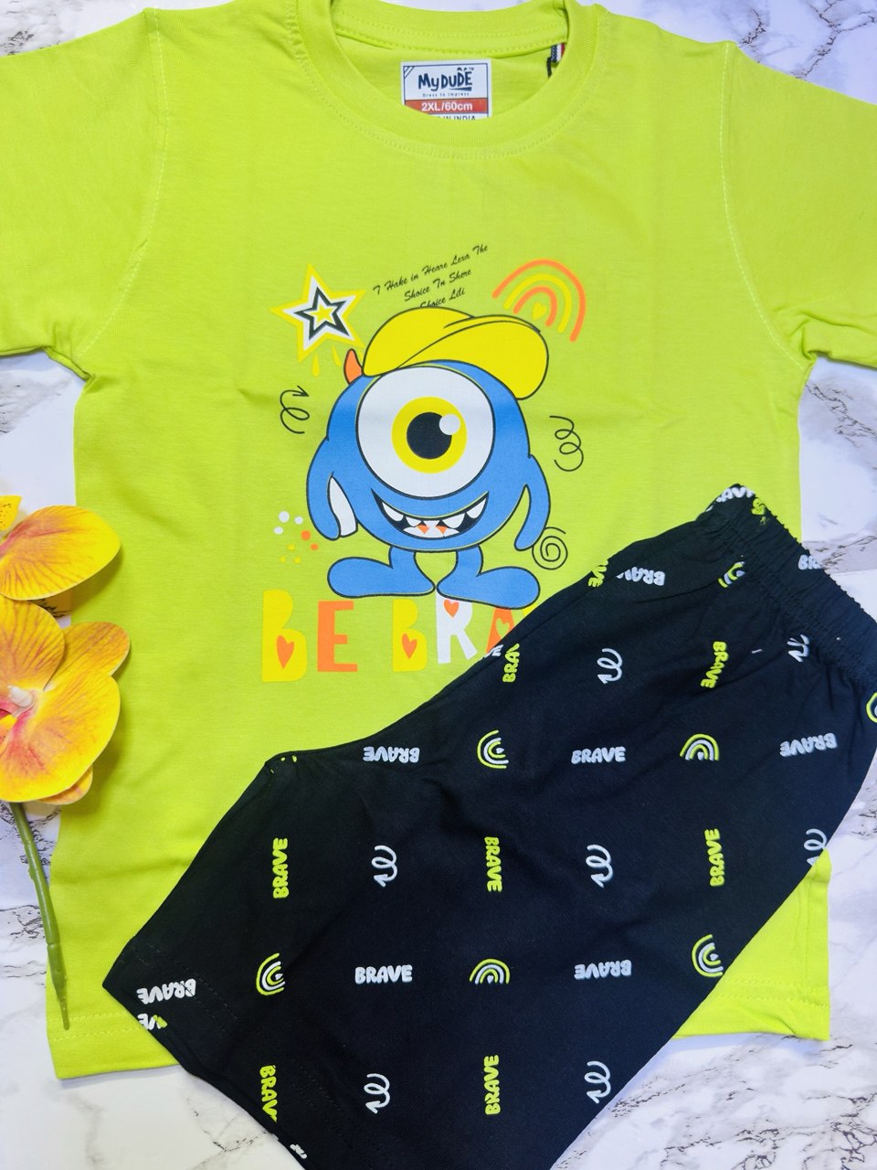 Give your child a bold and energetic look with this vibrant Neon Green T-shirt featuring a fun “Skateboar” Lion graphic. Crafted from 100% premium soft cotton, this outfit ensures maximum breathability for active boys. The set includes comfortable navy blue shorts with matching skater-themed prints, making it the perfect choice for playground adventures or casual summer outings.